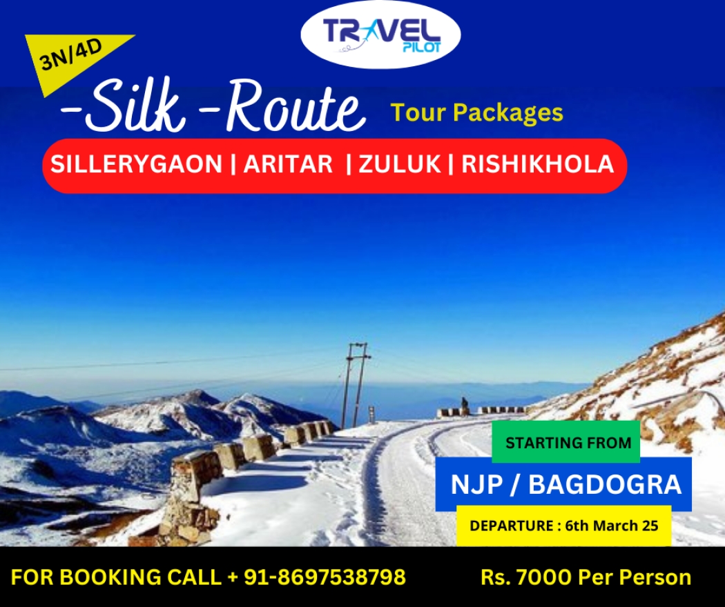 Explore the hidden beauty of Sikkim with our Silk Route Tour Package 3 Nights 4 Days from NJP to NJP. Starting at just Rs. 6,500 per person, this group package (minimum 15 people) covers enchanting villages, breathtaking mountain views, and cultural experiences. Perfect for families, groups, and nature lovers, Travel Pilot Holiday ensures a comfortable jouey with expert support and curated sightseeing.