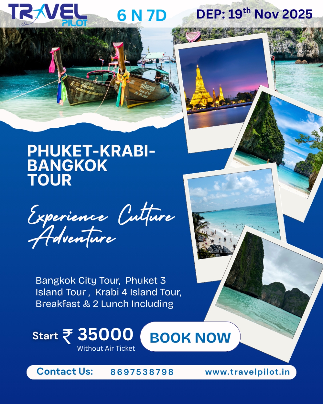 Travel Pilot Holiday presents an exciting Phuket–Krabi–Bangkok group tour starting from Kolkata on 19th November 2025. This 6 Nights / 7 Days Thailand package includes 2 nights in Phuket, 2 nights in Krabi, and 2 nights in Bangkok, offering the perfect mix of beaches, adventure, shopping, and culture.